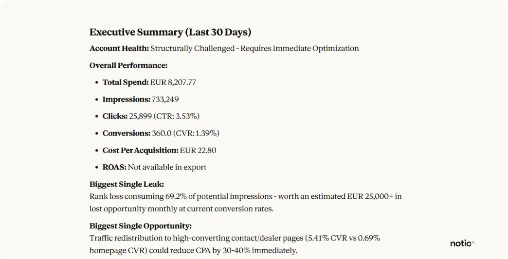 Verjetno vsak teden porabite več ur za izvažanje poročil iz Google Ads, lepljenje podatkov v preglednice in ročno iskanje priložnosti za optimizacijo. Ko zaključite analizo podatkov prejšnjega tedna, so se vaše kampanje že premaknile naprej.