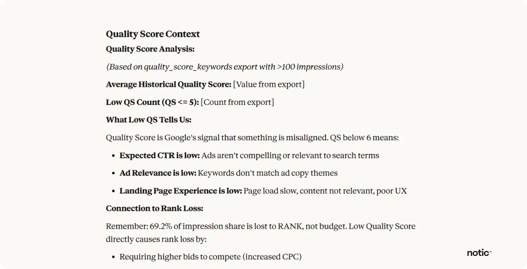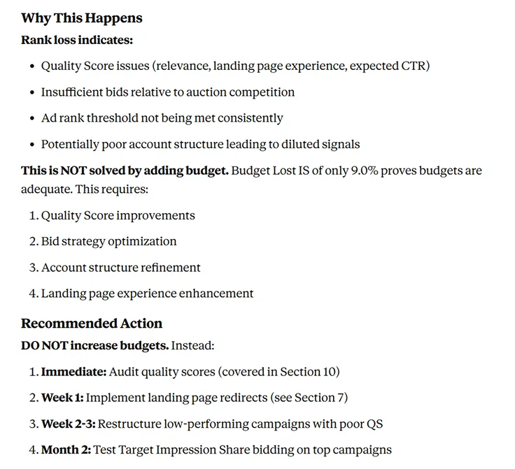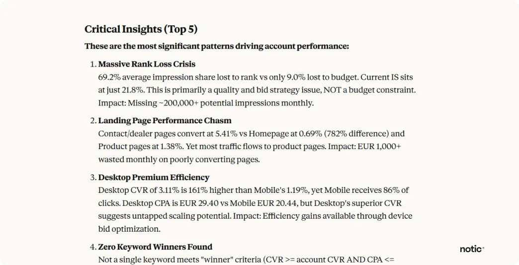 Namesto da ključne besede pregledujete ročno, eno za drugo, prosite Claude, naj analizira povezavo med relevantnostjo ključnih besed, uspešnostjo oglasnih besedil in izkušnjo na ciljni strani. Odkrije priložnosti za optimizacijo, ki jih s posameznimi pregledi kampanj ne bi opazili.