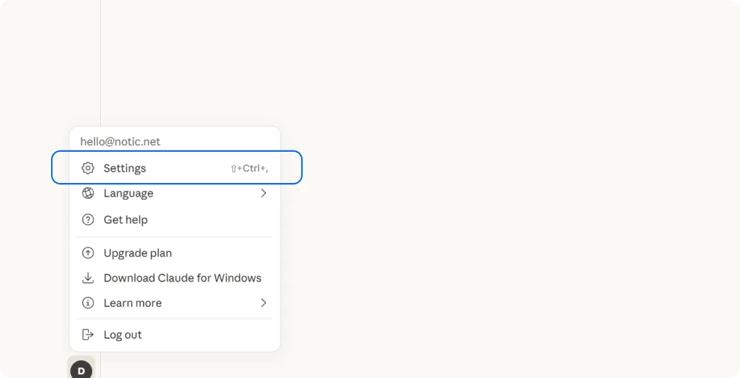 Odprite Claude v brskalniku. Kliknite na svoje ime spodaj levo, nato v Settings in izberite zavihek Connectors.