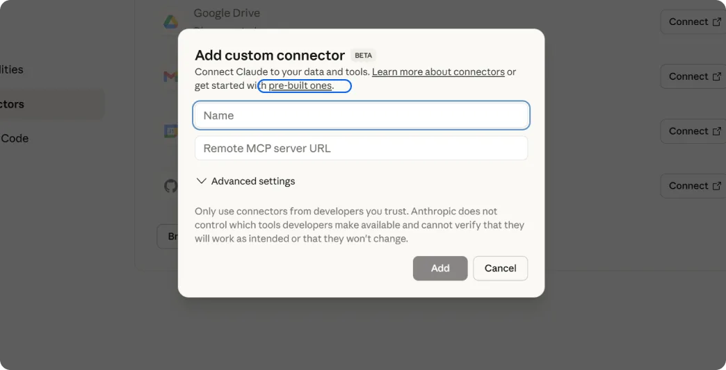 Poiščite gumb “Add custom connector” in ga kliknite. Nato kliknite na povezavo “pre-built ones”. Odprla se bo lista razpoložljivih MCP integracij.