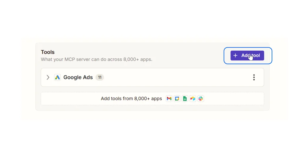 Nato kliknite “Add tools” in poiščite Google Ads v imeniku orodij. Izberite Google Ads API, da bo imel Claude popoln dostop do podatkov vašega računa.