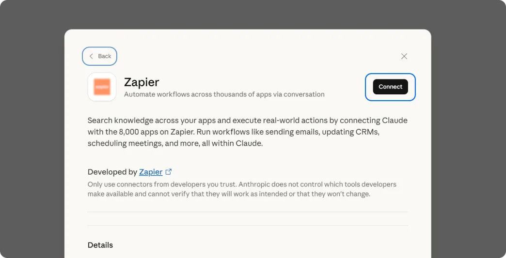 Pojdite nazaj v Claude (claude.ai/settings/integrations) in dodajte novo integracijo. Prilepite URL, ki ste ga kopirali iz Zapierja. Potrdite povezavo in odobrite dostop.