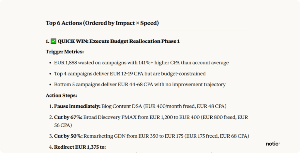 Ask Claude to compare cost-per-conversion across campaigns and recommend reallocation strategies. It analyzes the entire account and tells you exactly where to move budget for better ROI.