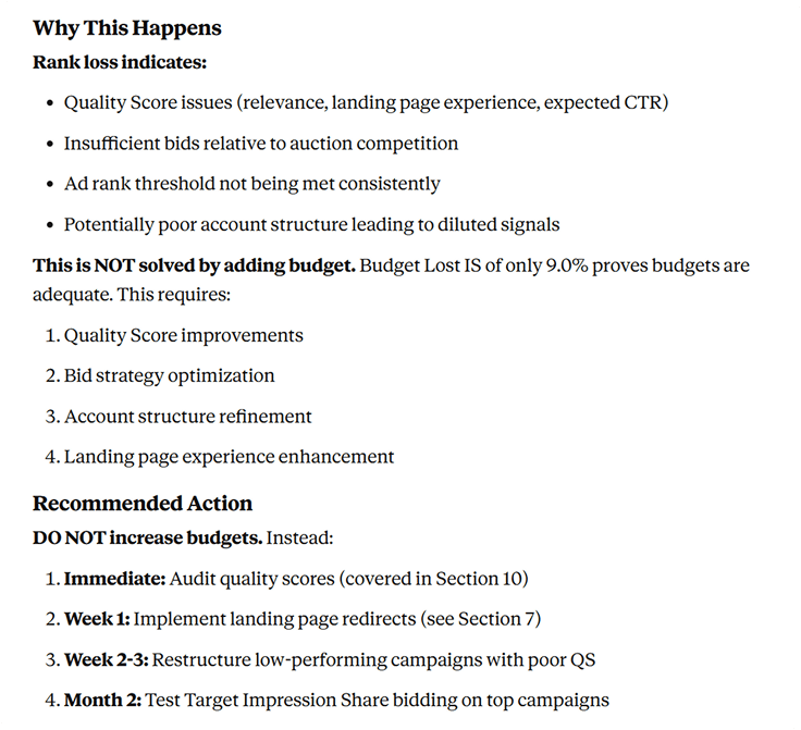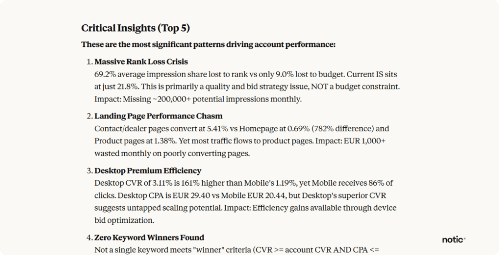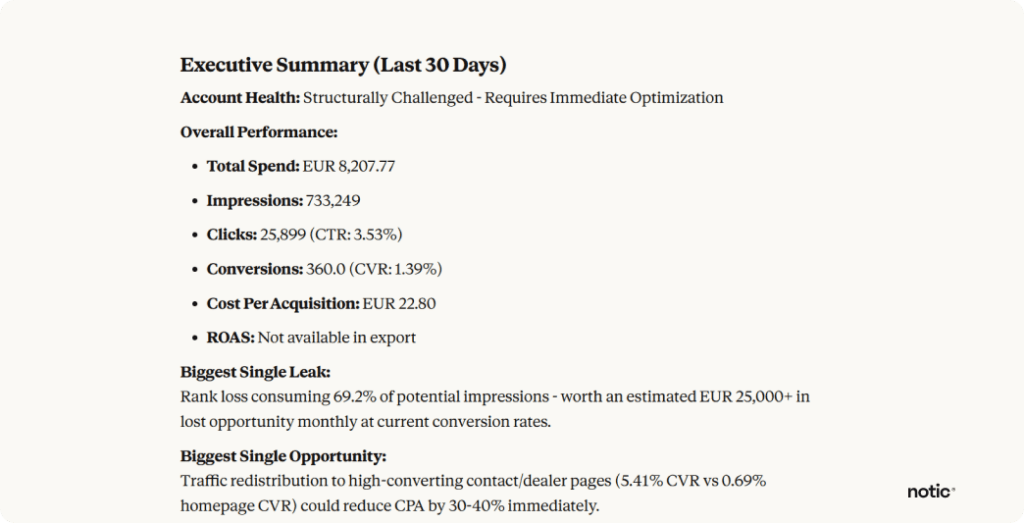 Competitive gaps: “Analyze my impression share data and tell me where competitors are beating me.”