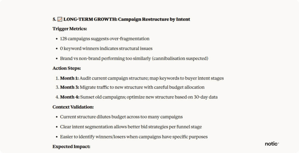 Instead of “How’s my account performing?” ask “Which ad groups in my brand campaign have CTR below 5% and why?”