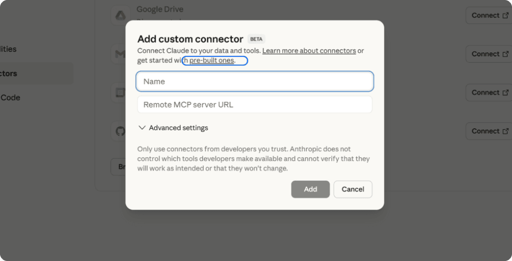 You’ll see an “Add custom connector” button. Click it. You should see highlighted text that says “pre-built ones.” Click that link. This takes you to a list of available MCP integrations.